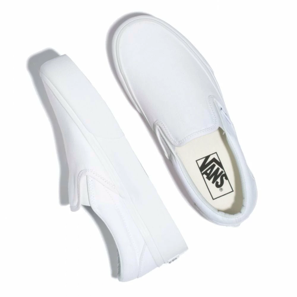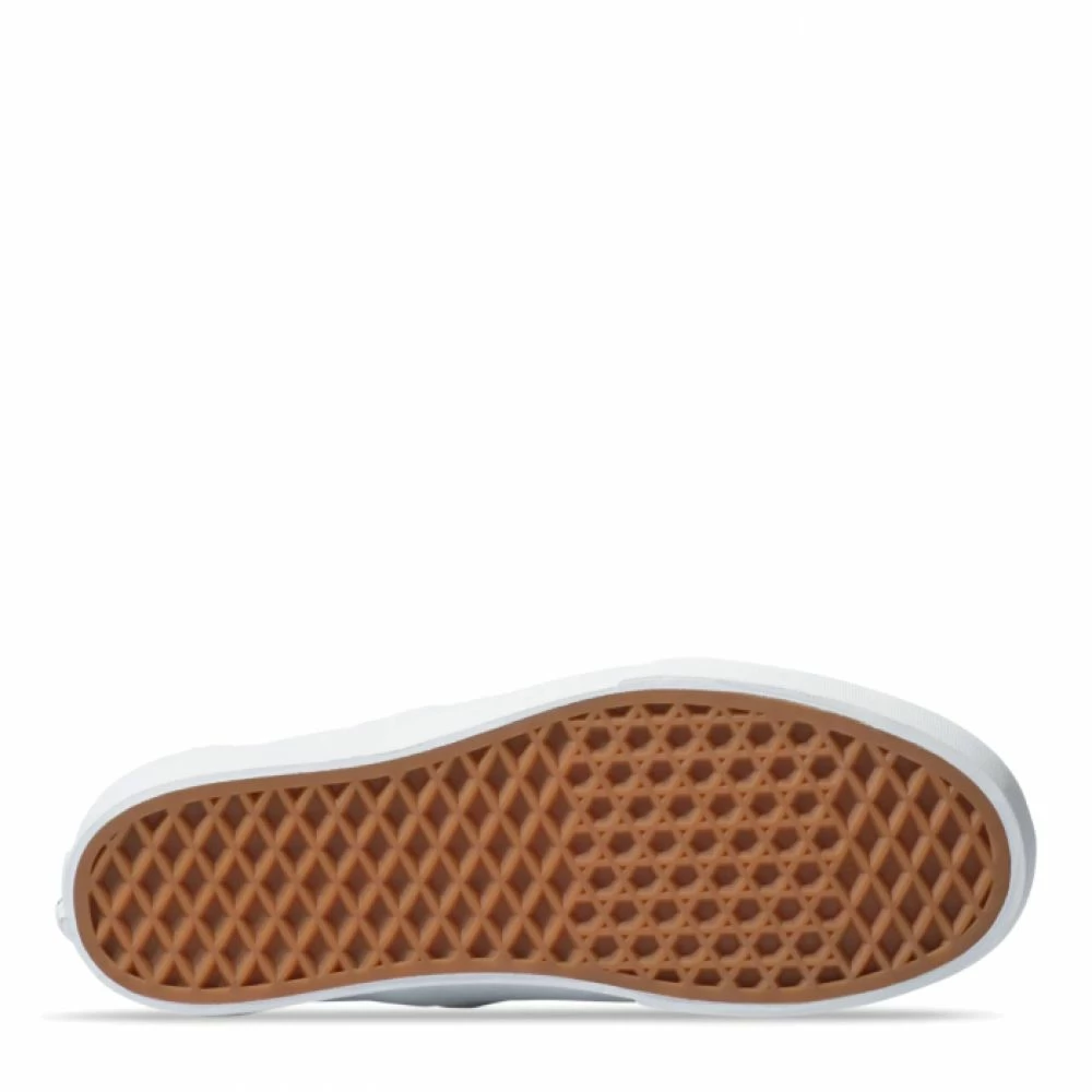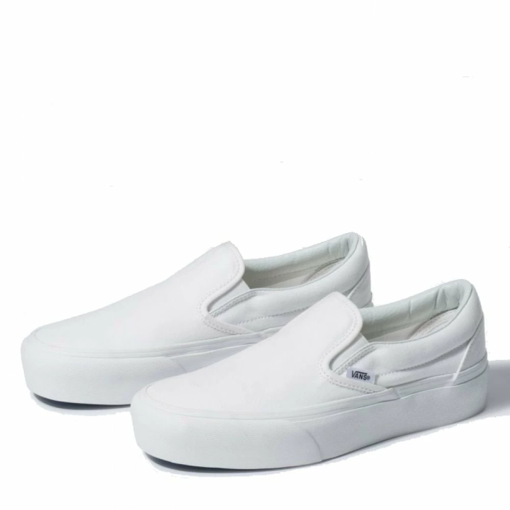 The Classic Vans Slip-On Platform features sturdy low profile canvas uppers, padded collars, elastic side accents, and a 25.4mm platform with signature rubber waffle outsoles.