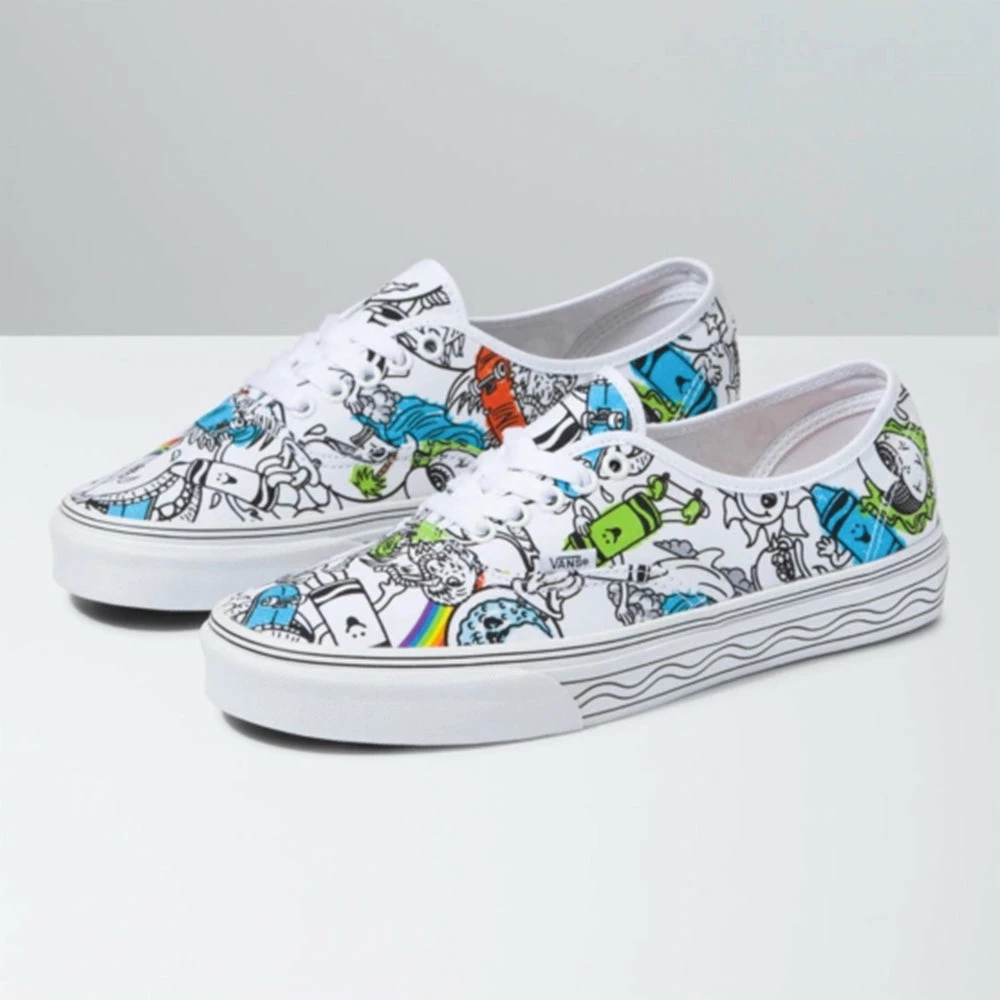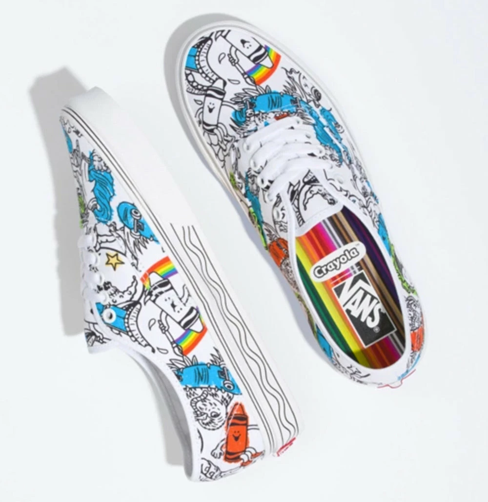 Vans x Crayola collection Vans’ original low top shoe Allover print encouraging DIY coloring Lace-up closure Sturdy textile uppers Metal eyelets Signature rubber waffle outsoles.